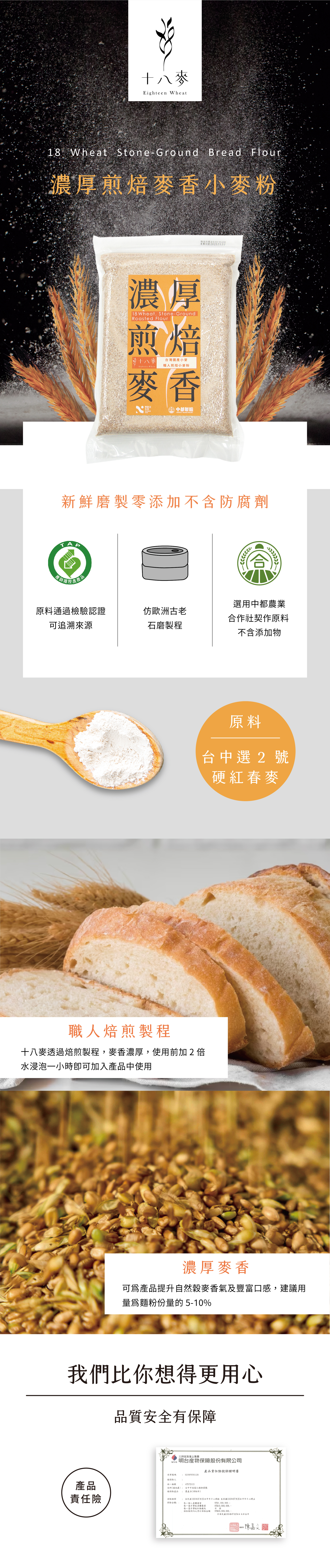 十八麥石磨式麵粉以類石磨製法,保留風味及麥香所在的麩皮,纖維含量較高,也保留更多的礦物質及營養素,散發國產小麥的真實風味。