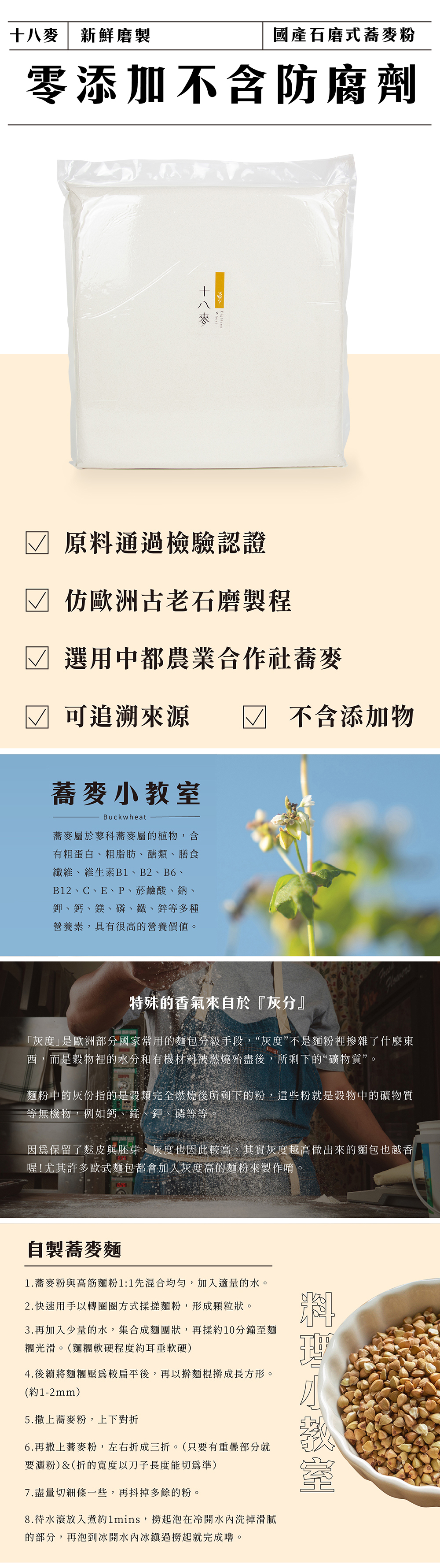 十八麥蕎麥粉將整顆甜蕎,以古老歐洲麵粉類石磨方式磨製。低溫慢速磨製的蕎麥粉保留更完整的營養性及礦物質,風味也更加獨特。