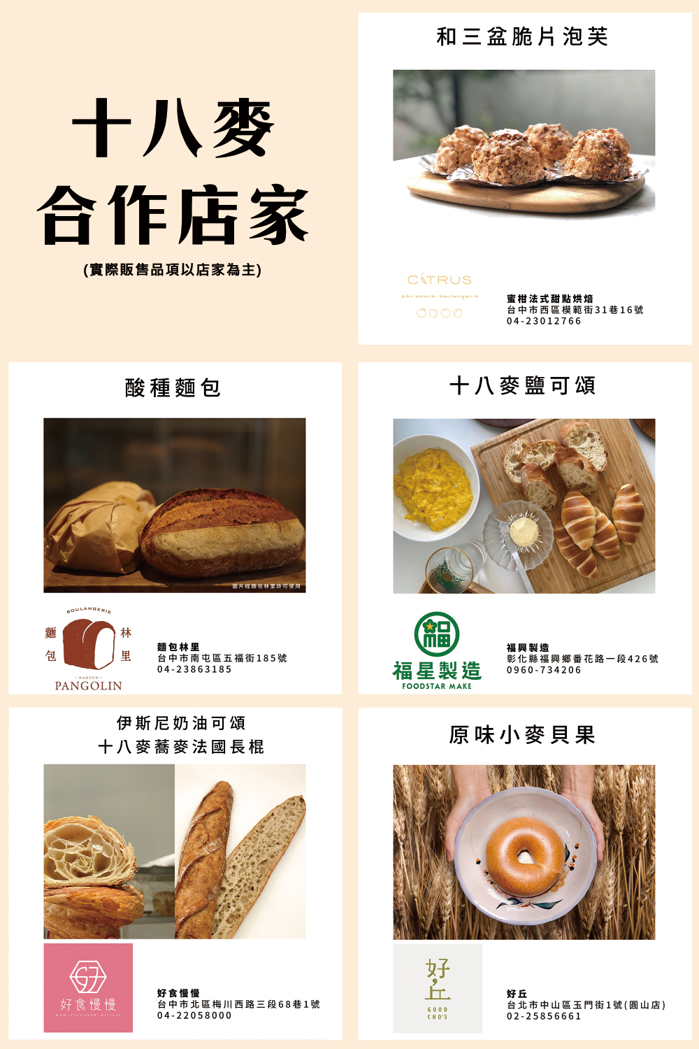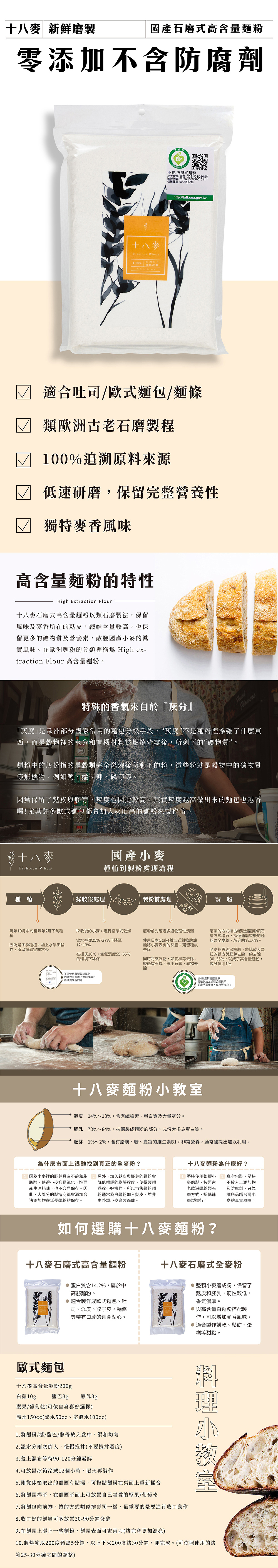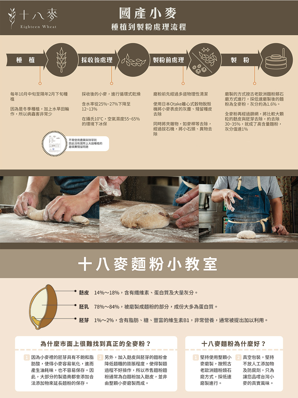 十八麥石磨式麵粉以類石磨製法,保留風味及麥香所在的麩皮,纖維含量較高,也保留更多的礦物質及營養素,散發國產小麥的真實風味。