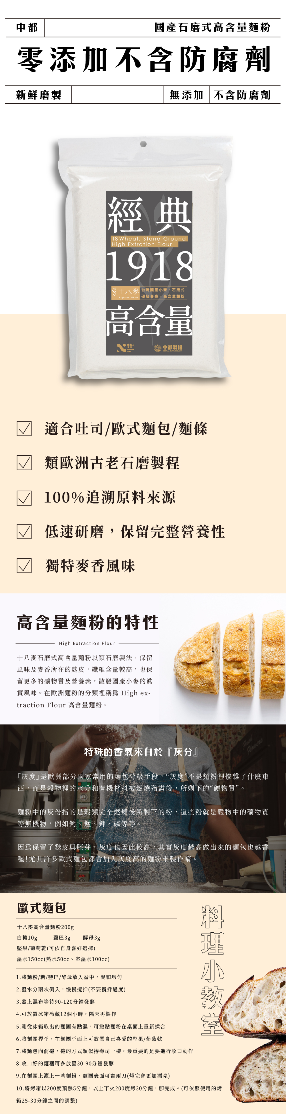 石磨式高含量麵粉:蛋白質含量14.2%,灰份質含量1%。