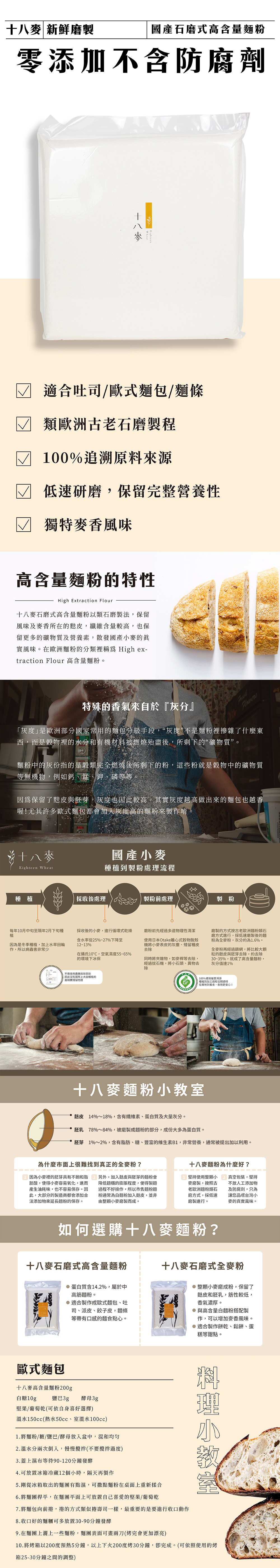 十八麥石磨式麵粉以類石磨製法,保留風味及麥香所在的麩皮,纖維含量較高,也保留更多的礦物質及營養素,散發國產小麥的真實風味。