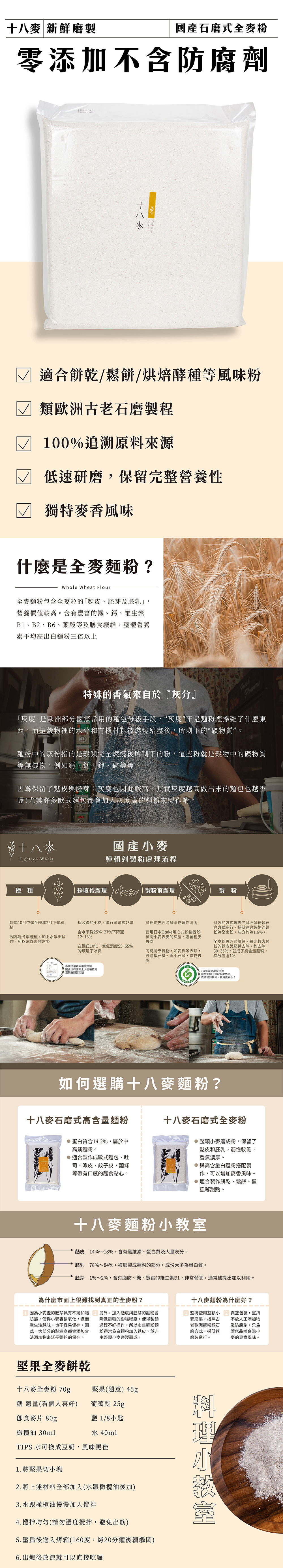 十八麥石磨式麵粉以類石磨製法,保留風味及麥香所在的麩皮,纖維含量較高,也保留更多的礦物質及營養素,散發國產小麥的真實風味。