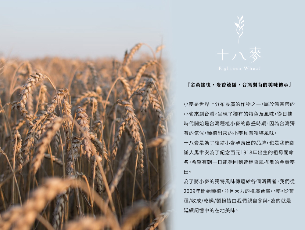 我們秉持復耕臺灣小麥與忠實呈現臺灣本土小麥真實原味的使命,從育種、收成、乾燥、磨粉等過程皆親力親為。