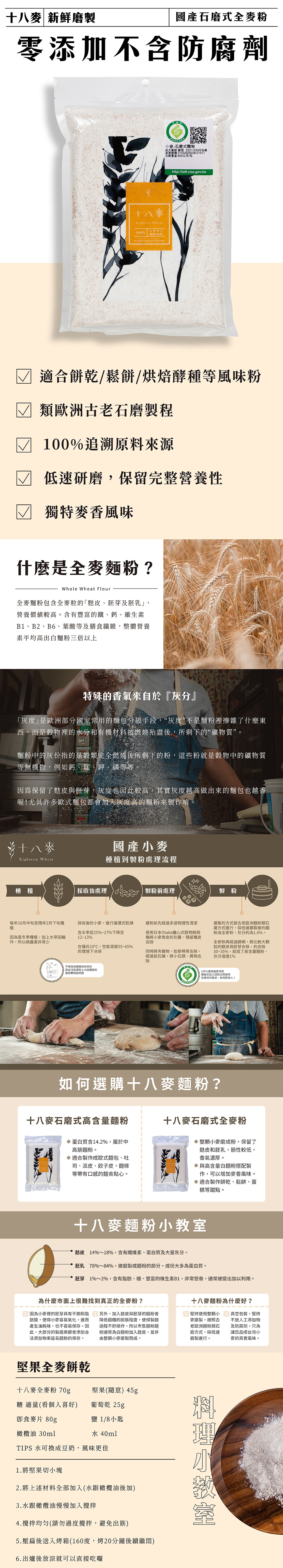 十八麥石磨式麵粉以類石磨製法,保留風味及麥香所在的麩皮,纖維含量較高,也保留更多的礦物質及營養素,散發國產小麥的真實風味。