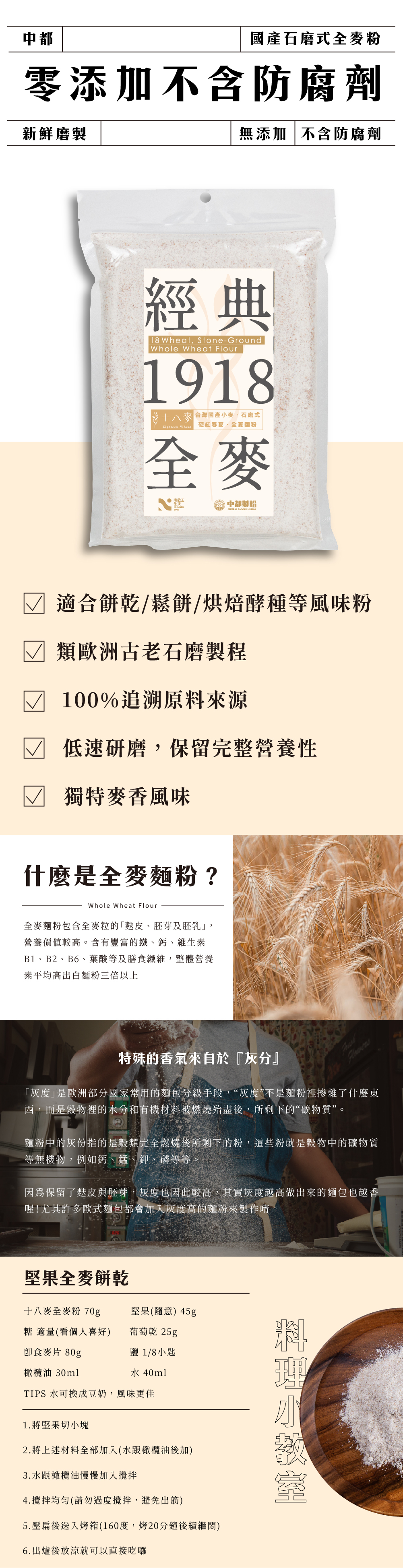 石磨式全麥粉:蛋白質含量13.3%,灰份質含量1.6%。