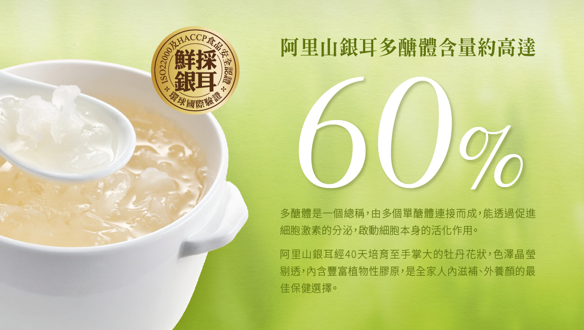 自古以來貴為養生聖品的「銀耳」,營養價值豐富,內含銀耳膳食纖維、氨基酸及多種礦物元素,其中最為關鍵的呵護養顏成分「多醣體」深受女性朋友們喜愛。
