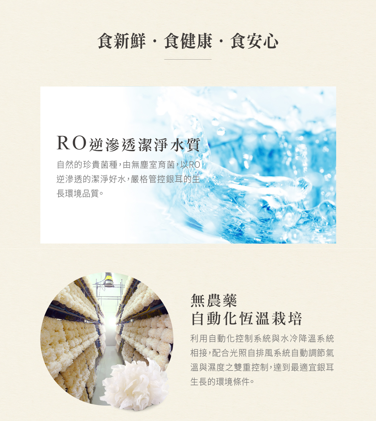 有機銀耳來自潔淨無污染的環控栽培場,雲端智慧調控最佳的生長環境,以生飲等級的RO逆滲透水霧分子灌溉,細心養成朵朵水潤飽滿,散發陣陣清香的高品質珍貴銀耳。