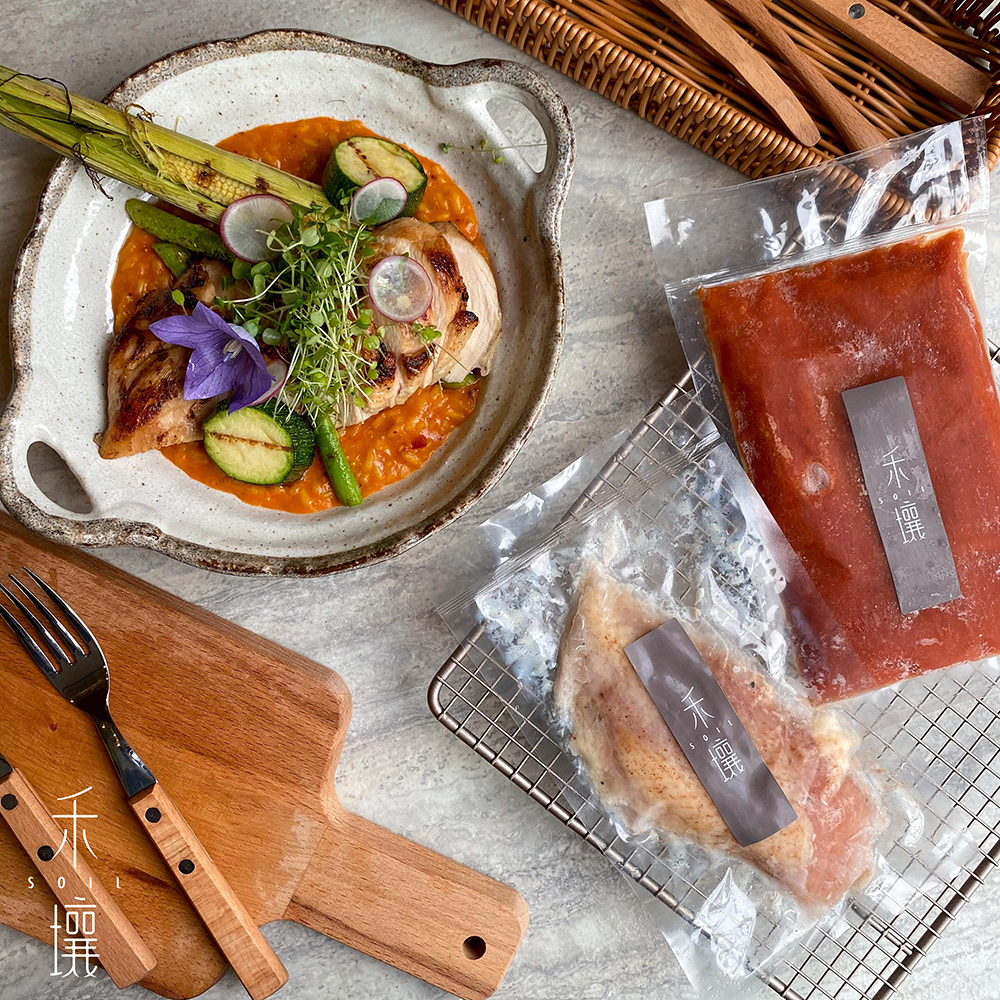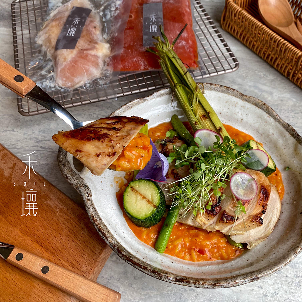 選用台灣的桂丁雞,皮薄鮮甜,煎過香嫩多汁。可製作成溫沙拉或是搭配飯麵。
